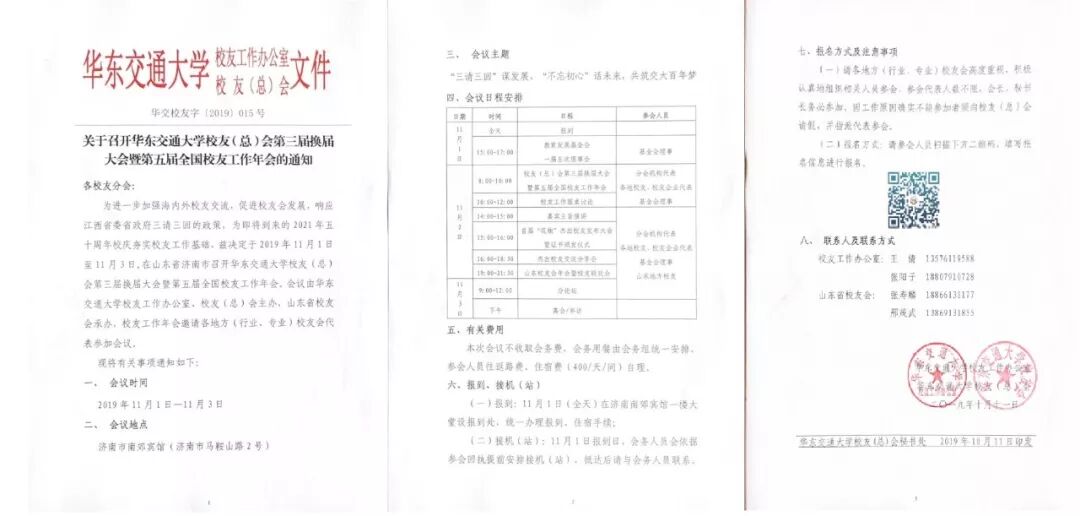 会议时间 2019年11月1日—11月3日 会议地点 济南市南郊宾馆(济南市马鞍山路2号) 会议主题 “三请三回”谋发展、“不忘初心”话未来, 共筑交大百年梦 会议日程安排 报到 教育发展基金会 一届五次理事会 校友(总)会第三届换届大会暨第五届全国校友工作年会 分会机构代表 各地校友及校友企业代表 基金会理事 分会机构代表 各地校友及校友企业代表 基金会理事 山东地方校友 首届“花椒”杰出校友发布大会暨证书颁发仪式 分论坛 分会机构代表 各地校友及校友企业代表 基金会理事 山东地方校友 有关费用 报到、接机(站) (一)报到:11月1日(全天)在济南南郊宾馆一楼大堂设报到处,统一办理报到、住宿手续; (二)接机(站):11月1日报到日,会务人员会依据参会回执提前安排接机(站),抵达后请与会务人员联系。 报名方式及注意事项 (一)请各地方(行业、专业)校友会高度重视,积极认真地组织相关人员参会,参会代表人数不限,会长、秘书长务必参加,因工作原因确实不能参加者须向校友(总)会请假,并指派代表参会。 (二)报名方式:请参会人员扫描下方二维码,填写报名信息进行报名。 联系人及联系方式 王 倩 13576119588 张阳子 18807910728 张寿麟 18866131177 邢茂武 13869131855 郑 涛 15069190997 华东交通大学全国校友工作年会每两年召开一届,旨在让各学院、相关部门、校友分会了解学校校友工作的开展近况,搭建一个学校与校友分会、学院与校友分会、校友分会之间互动交流,集思广益,共同促进校友工作新发展的平台。 校友是母校一张靓丽的名片,母校的建设发展离不开校友的关心与支持,欢迎各界校友踊跃报名,积极参与 ,共创校友工作新纪元。11月1日 日程 参会人员 全天 15:00-17:00 基金会理事 11月2日 日程 参会人员 08:00-10:00 10:00-12:00 校友工作圆桌